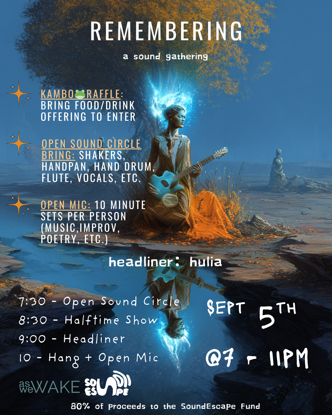 Open Sound Circle: This will be a free flow group jam for any skill level. That being said, bring instruments like drums, flute, handpan, shakers that promote a more collective sound experience.